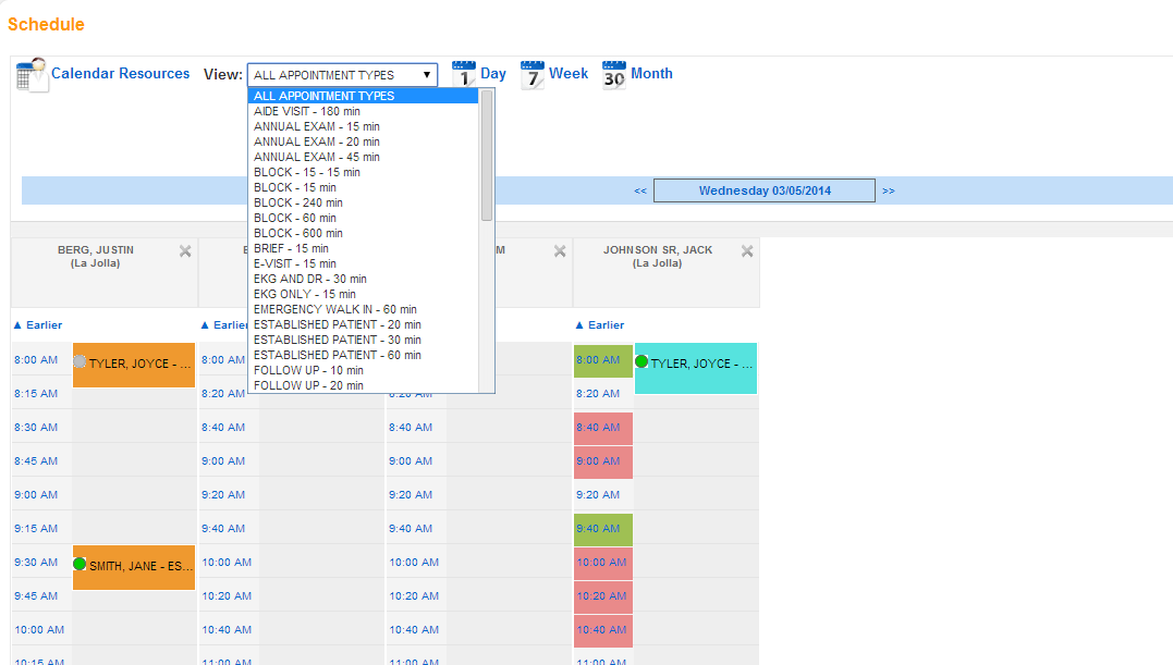 - Select a specific appointment type from the dropdown box to filter the appointments viewed.