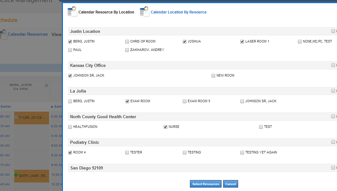 - Click "Calendar Resources" and select individual resources, or click "Select All" to choose all resources for a given location.