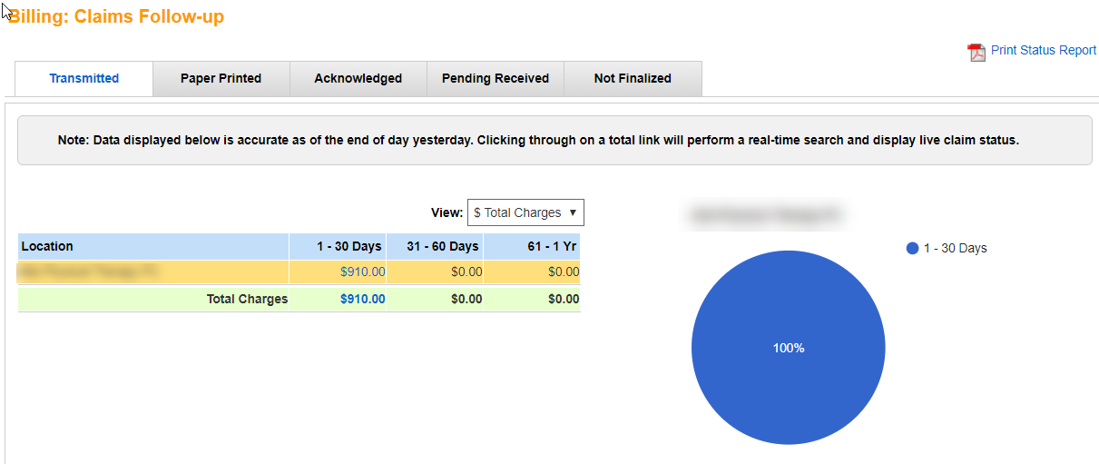 The “Claims Follow-up” dashboard displays claims that have been billed but have not been paid. The claims are grouped in the standard aging buckets. To access it go to (1) Billing > (2) Claims > (3) Claims Follow Up