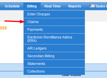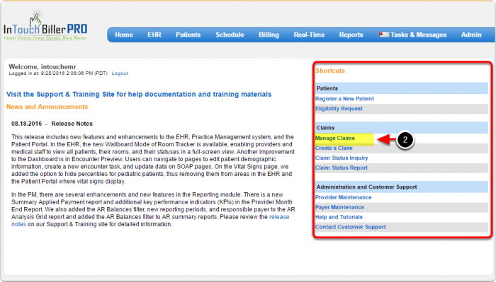 1. On In Touch Biller Pro’s Dashboard/Home Page go to Billing > Claims then click on Manage Claims.