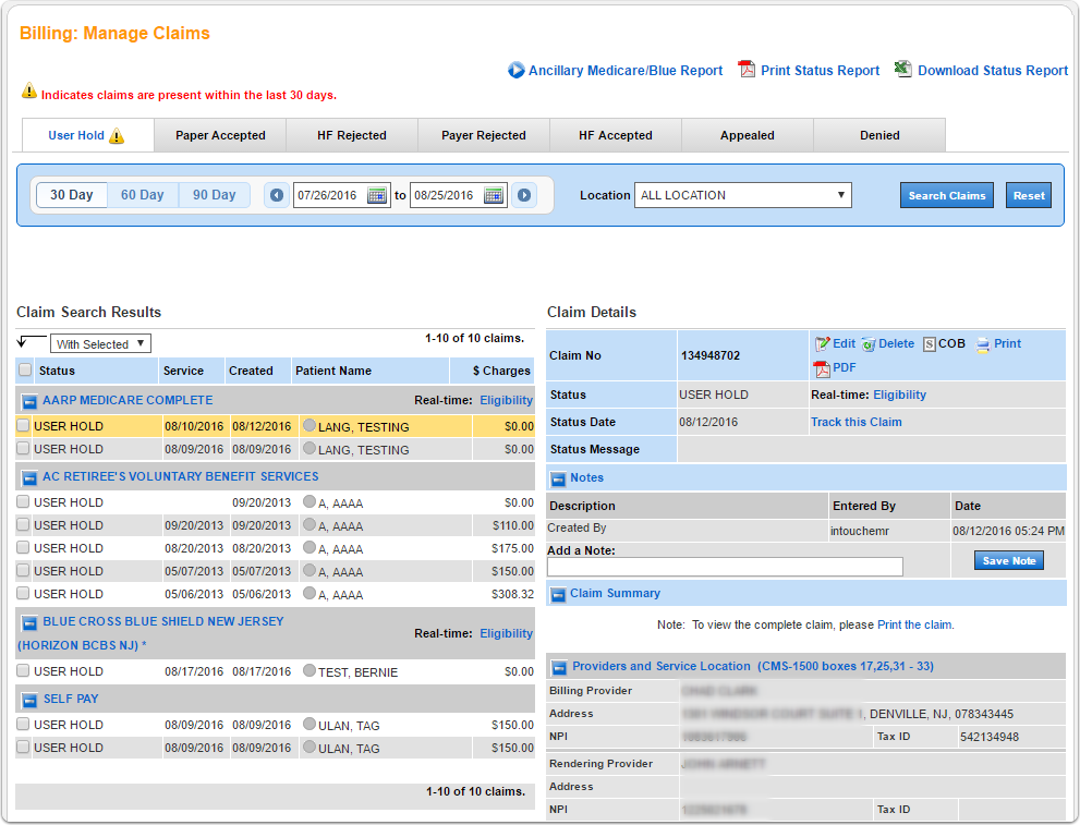- User Hold – this is where you access the claims that have not been billed yet. This is also where you can delete, edit and submit the claims.