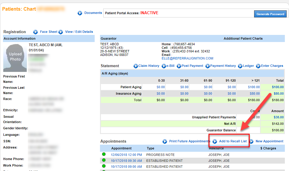 To add a patient in a "Recall List" please access the patient's chart. On the patient chart's Appointment section, click on the "Add to Recall List"