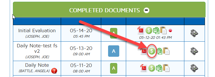 When the document appears in the Patient Dashboard, it will include a dollar sign that will allow users to review what the claim details are for that completed document.