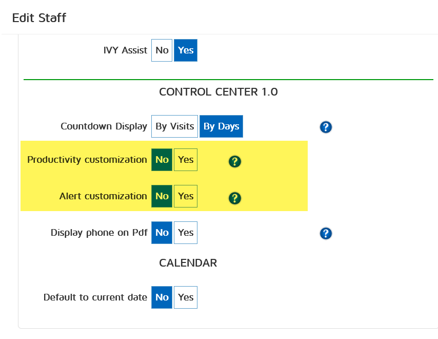 When set to 'YES', the user is able to customize the items visible on the control center under the 'productivity' tab, by choosing whether the following are visible or not.