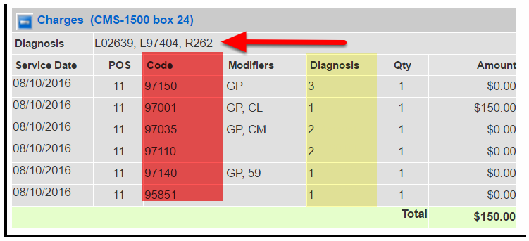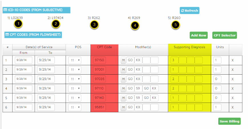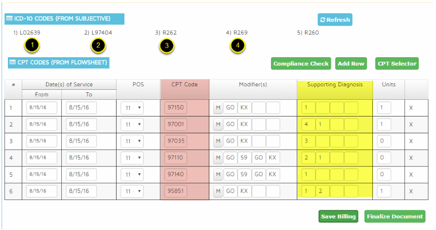 If you look at the ‘supporting diagnosis’ in the yellow column below, you’ll notice that all the pointers exactly match the corresponding CPT codes. This reduces claim denials, and is best practice for billing and coding.