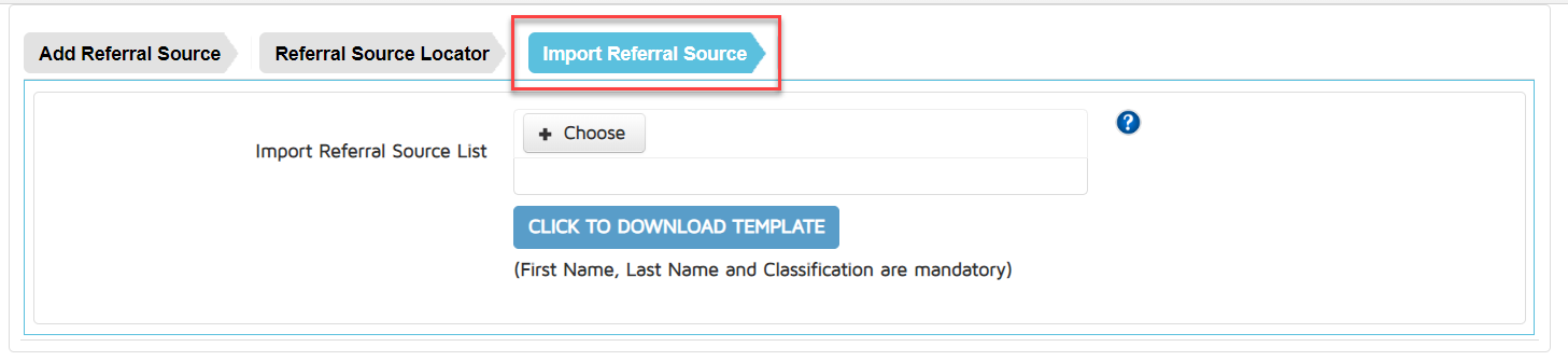 In the Import Referral Source tab, users will have the ability to upload a list of referral sources in their account. This makes it easy to upload a list in bulk.