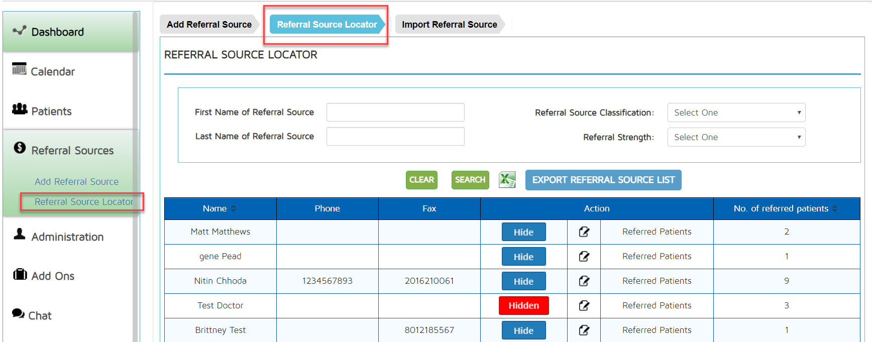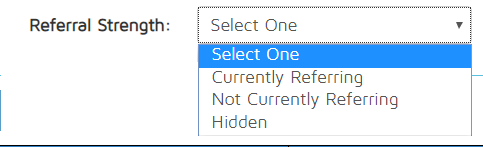 - Referral Strength - Choose from the drop-down list to filter the list based on whether the Referring Provider is currently Referring, Not Referring or Hidden.