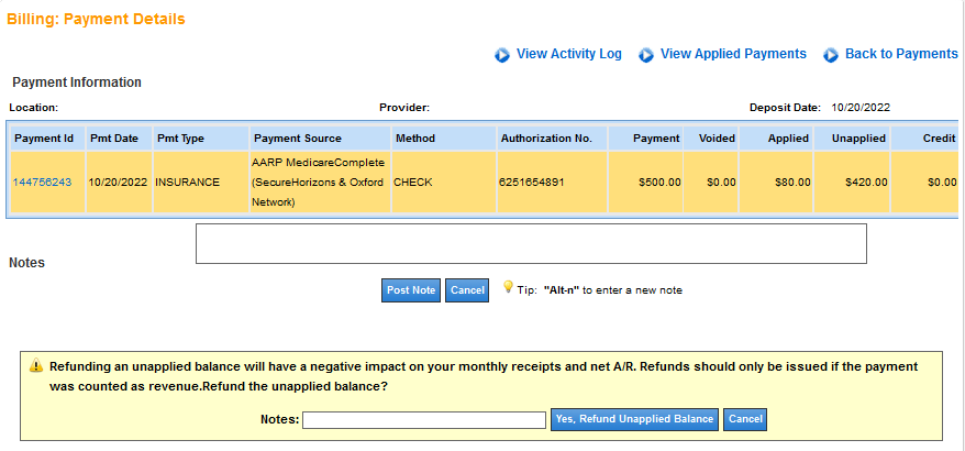 This section explains the steps and reasoning for refunding an unapplied balance. When a payment is posted in In Touch Biller PRO the entire amount of the payment is in the unapplied status. If the unapplied balance of the check is paid back to the patient or insurance the balance should be refunded.