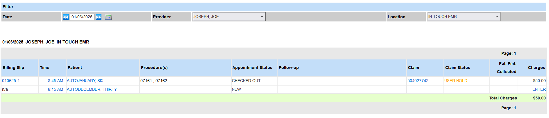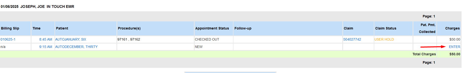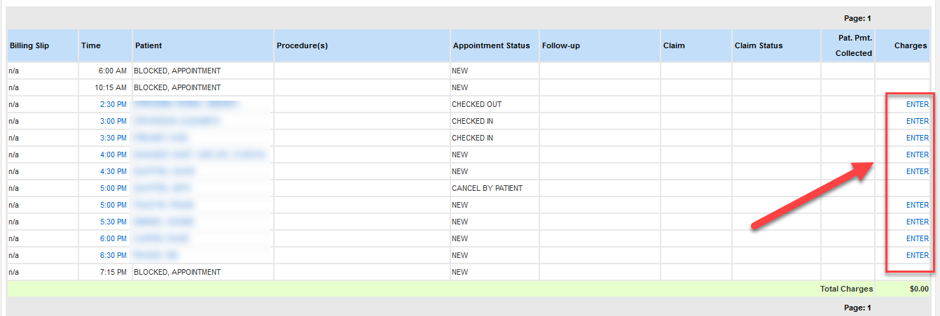 - If a charge has not been created for an appointment, the Charges column will display an "Enter" link.