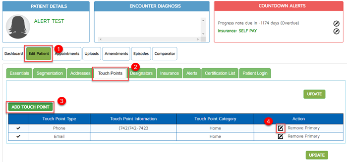 - Click Edit icon on the touch point (Please be advised that there are some phone numbers that is automatically coming over from In Touch Biller Pro).