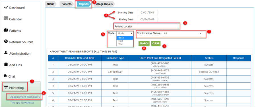 - Touch Point and Designated Patient - this will give you information as to which phone number, or email was used to send the appointment reminder.