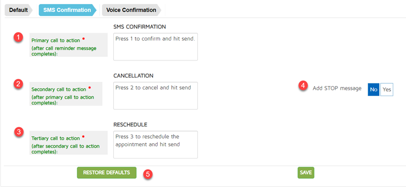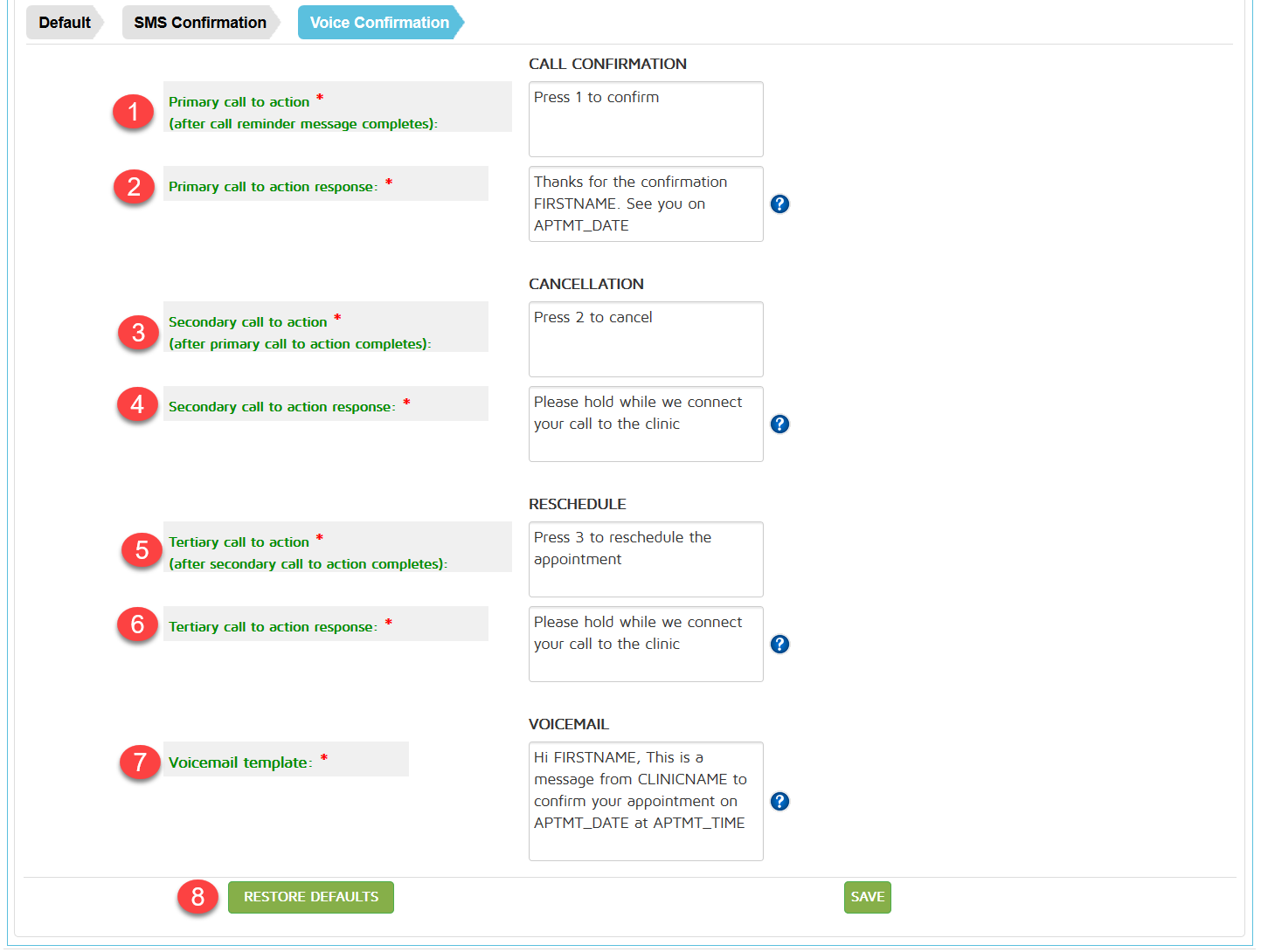 Once you have enabled Confirmation, you need to set the confirmation settings. This is what your patients will hear after the initial message that will allow them to confirm their appointment. They will click these options while on the call to let you know if they are either confirming, cancelling or rescheduling their appointments.