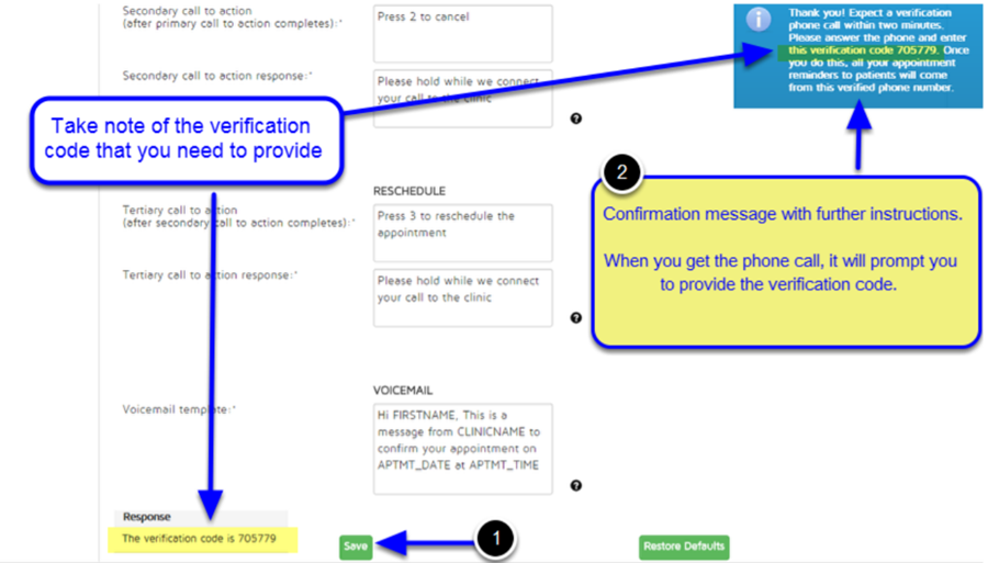 - After making the changes to the settings on the appointment reminder, click on Save. This will automatically provide you with a verification code.