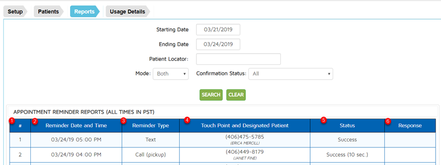 - Response - this will give you information regarding the patient's confirmation about the appointment reminder they received.