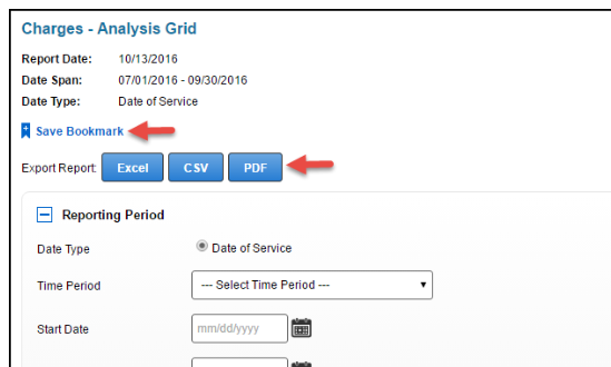 - Date span selection is important for bookmarks to be used properly. You must select the dates using the drop-down options (e.g., last month) on the Reports home page.