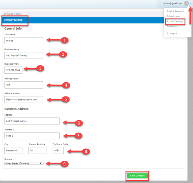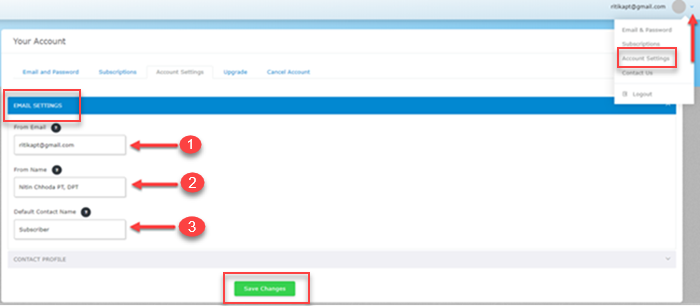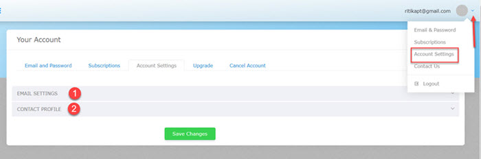 Click on the drop-down arrow beside your email address in the upper right corner and choose Account Settings. There are two options once the user clicks Account Settings, the Email Settings, and the Contact Profile.