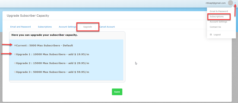 To upgrade the user's subscription, go to the email drop-down menu and choose Subscriptions. Then click the Upgrade tab.