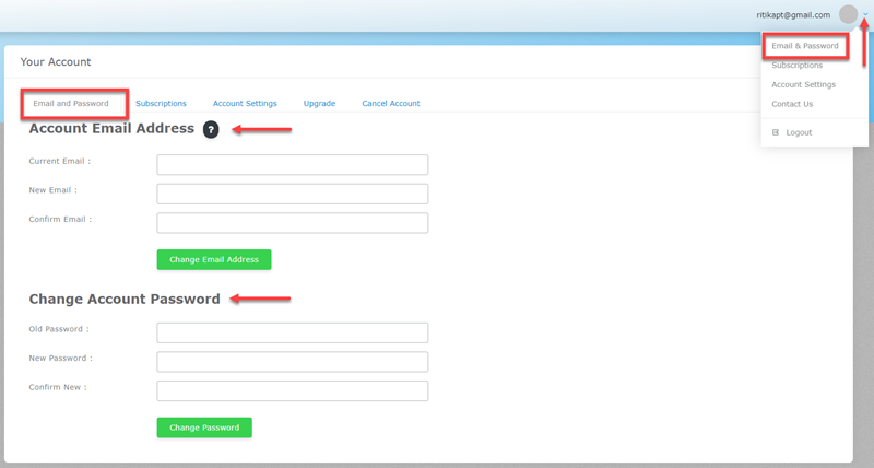 To change the account email and password, click the drop-down arrow beside your email address in the upper right corner and choose Email & Password.