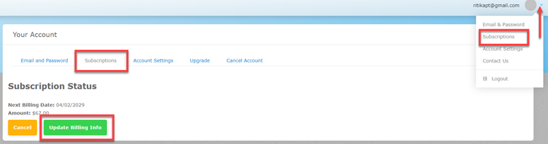 To update the payment method, go to the email drop-down menu and choose Subscriptions.